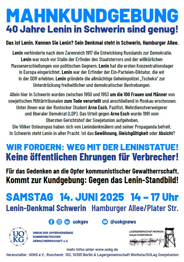 40 Jahre steht nun schon das Lenin-Denkmal am Großen Dreesch in Schwerin. Eine Schande und Zumutung für alle Verfolgten des Kommunismus und Gulag-Opfer!