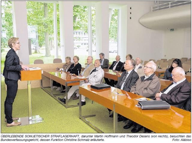 Inzwischen setzt die nächste Generation die Forschungsarbeit der Workuta- Veteranen fort. Der 1958 geborene Joachim Desens gehört dazu. "Das Unrecht, das meine Familie zweimal erlitten hat – durch die Vertreibung aus Pommern und die Inhaftierung meines Vaters – ist sicher mit ein Grund für meinen beruflichen Weg", sagt der Oberstaatsanwalt aus Potsdam. Für die einstigen Lagerhäftlinge organisierte er gestern eine Sonderführung im Bundesverfassungsgericht als zentralem Element bundesdeutscher Rechtsstaatlichkeit. "Dies kennenzulernen, ist etwas Besonderes für uns", sagt Desens senior. Das Leid politisch verfolgter Deutscher ist ihm auch aus seiner Arbeit im Ausschuss der Stiftung für ehemalige politische Häftlinge in Bonn vertraut: "Viele DDR-Bürger haben gelitten."