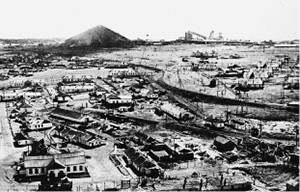 Tod im Eis: Eines der Lager von Workutlag mit Schacht Nr. 1, Kapitalnaja, im Hintergrund. Die Aufnahme wurde 1956 heimlich vom Haldengipfel des Schachts 9-10 aufgenommen.