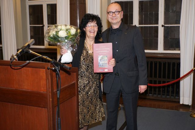 - Ursula Popiolek und Bibliotheksleiter Thomas Dahnert mit dem Jubiläumsalmanach.