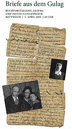 Der Eintritt ist frei. Eine Anmeldung ist nicht erforderlich. "Diese Zeilen sind mein ganzes Leben..." Briefe aus dem Gulag Buchvorstellung, Lesung und Zeitzeugengespräch Wer: Veranstalter Metropol-Verlag Wann: Mittwoch, 3. April 2019, 18 Uhr Wo: Bundesstiftung zur Aufarbeitung der SED-Diktatur, Kronenstraße 5, 10117 Berlin https://www.bundesstiftung-aufarbeitung.de/veranstaltungen-2019-6978.html?id=3446/