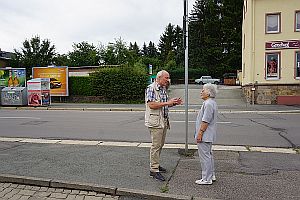 - Stefan Krikowski im Gespräch mit Frau Kreyßig, vor dem Ort, wo früher ihr Wohnhaus gestanden hatte.