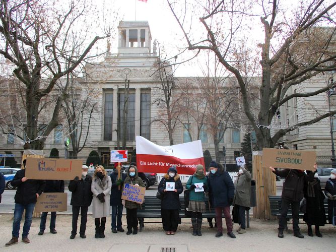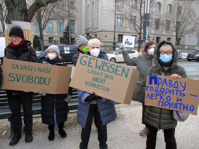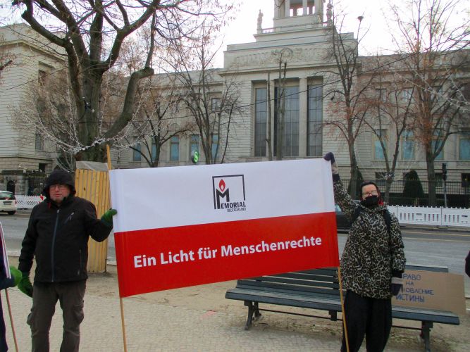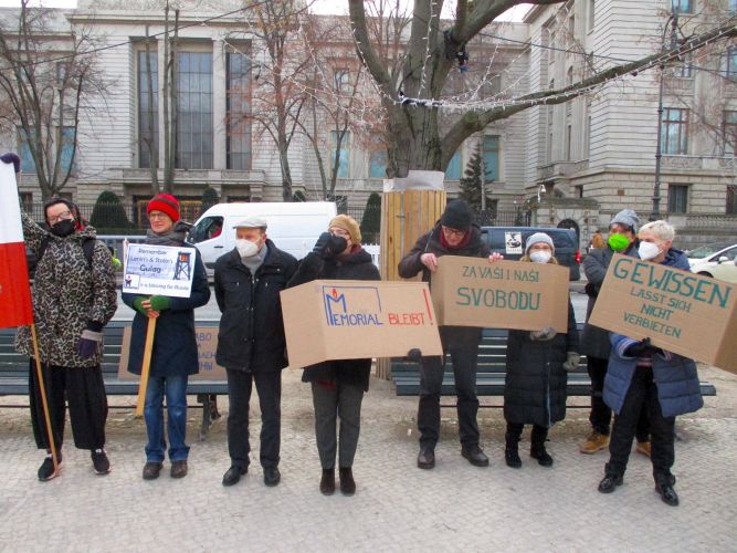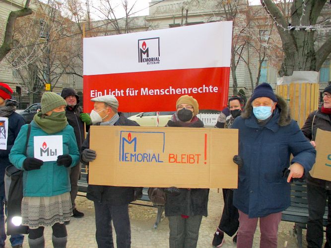 Gestern noch standen etwa zwei Dutzend aufrechte Mitstreiter und Sympathisanten der Menschenrechtsorganisation MEMORIAL bei Eiseskälte demonstrierend u.a. vor der russischen Botschaft 'Unter den Linden' in Berlin.
