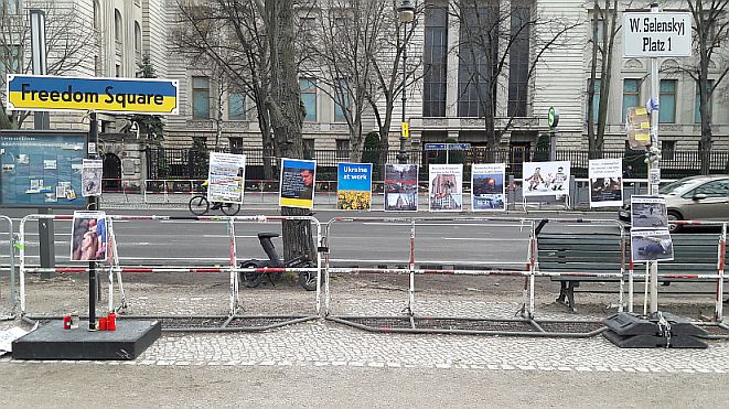 Auf dem Mittelstreifen vor der russischen Botschaft in Berlin standen bis zum 13. April u.a. folgende Gedenk- und Protestelemente: Ein Baustellenschild mit dem Namensschild "W. Selenskyj Platz 1" und ein anderes mit dem Namen "Freedom Square". Dazwischen waren zwei Seile gespannt mit acht DIN A2 großen laminierten Farbplakaten.