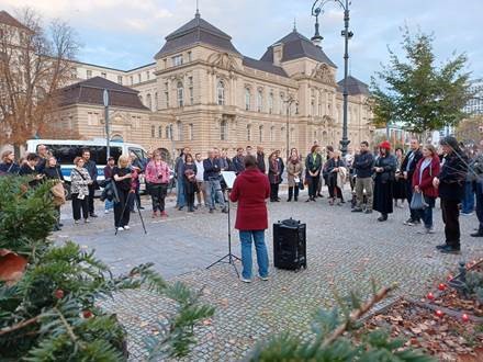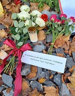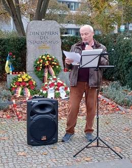 Bei schönstem Herbstwetter kamen etwa 100 Personen zur Gedenkveranstaltung, darunter etliche Russen und Ukrainer. Viele lasen Namen ihrer eigenen Familienmitglieder oder anderer für sie wichtige Personen, die Opfer kreml‘scher Gewaltherrschaft wurden, vor. So hat Frau Sabine Erdmann-Kutnevic an das Schicksal ihres Onkels Hans-Jürgen Erdmann erinnert. Er arbeitete bei der SAG Wismut und wurde im Sommer 1951 verhaftet. Er wurde zum Tode verurteilt und am 26. Juni 1952 in Moskau erschossen. Seine Nicht-Rehabilitierung belastet die Familie bis zum heutigen Tag. Weiterhin erinnerte Frau Erdmann-Kutnevic an Boris Romanchenko , 96 Jahre und Überlebender mehrerer deutscher KZ, der im März 2022 in seiner Wohnung in Charkiw nach russischem Raketenbeschuss verstarb, und an Liza Dmytrieva, 4 Jahre, gestorben am 14.7.2022 nach russischem Raketenbeschuss auf Winnyzja auf dem Weg von der Logopädin nach Hause. Sie hatte das Down-Syndrom und wurde von ihrer Mutter "kleiner Engel" genannt. Frau Nora Kreis, Mitarbeiterin der Beauftragten des Landes Sachsen Anhalt zur Aufarbeitung der SED-Diktatur, stellte das gerade erschienene Buch mit all den vielen Namen, die an diesem Nachmittag verlesen wurden, vor: ABGEHOLT, VERSCHWUNDEN, HINGERICHTET - Politische Verfolgung in Sachsen-Anhalt 1945 bis 1953. Hg.: Birgit Neumann-Becker. https://lesbar-kressbronn.buchkatalog.de/abgeholt-verschwunden-hingerichtet-9783963114632