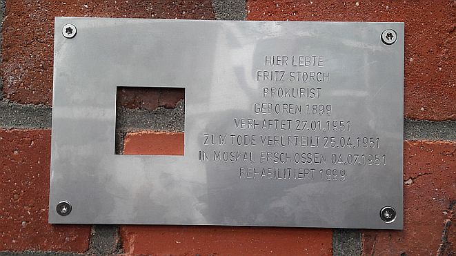 Am Freitag, den 8. Juli 2022 wurde die insgesamt 4. Gedenktafel "Letzte Adresse" in Deutschland angebracht. Gedacht wurde Fritz Storch, der am 4. Juli 1951 in Moskau erschossen wurde. Die Hauptmilitärstaatsanwaltschaft der Russischen Föderation rehabilitierte ihn posthum am 29. März 1999.