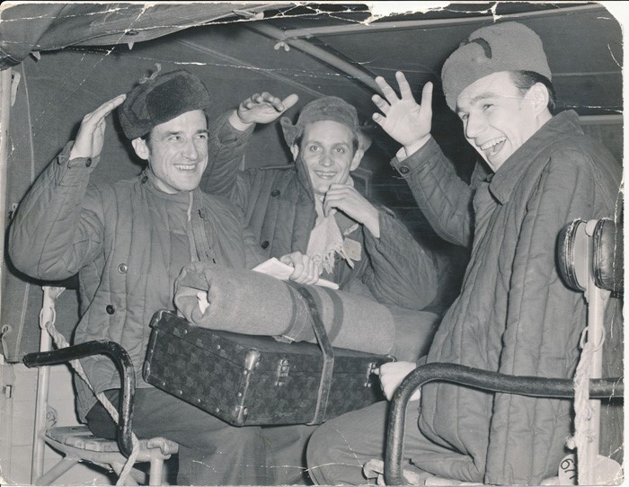 Johannes Krikowski (Mitte) trifft am 12. Dezember 1955 zusammen mit insgesamt 57 Heimkehrern (Zivil- und Kriegsgefangene aus dem Lager 5110/55) mit einem Sondertriebwagen aus Fürstenwalde in Berlin ein. Die Heimkehrer waren am 6. Dezember vom Sammellager Gorki/UDSSR in Marsch gesetzt worden, nachdem sie bereits am 19. Oktober die Heimreise hatten antreten sollen. Die Transporte waren jedoch ohne Angaben von Gründen ausgesetzt worden.