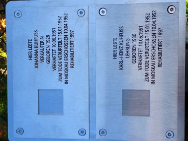 - Hier lebten: Johanna Kuhfuß und Karl-Heinz Kuhfuß. Möge ihr Andenken ein Segen sein.